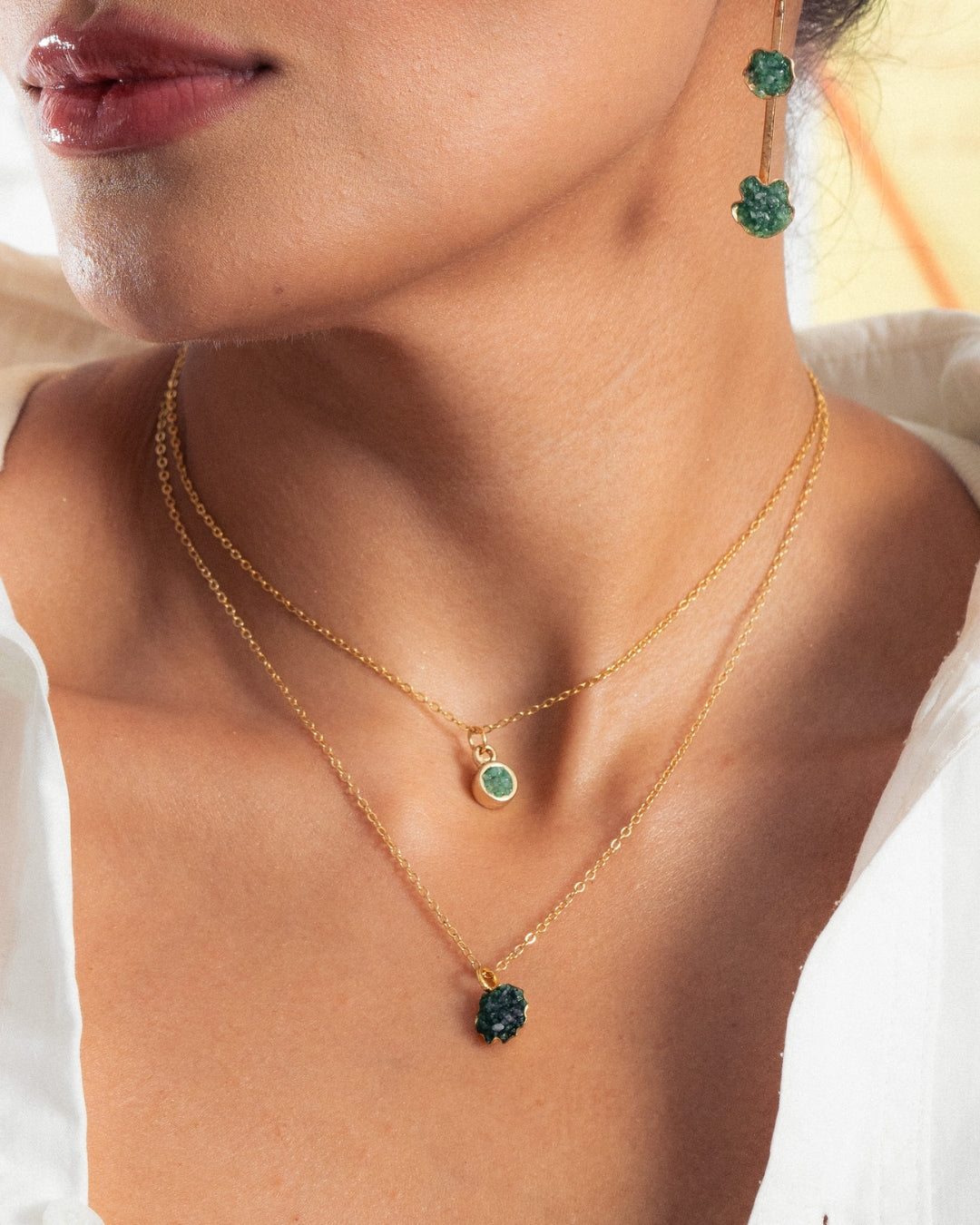 Núcleo Interior se siente como ese centro silencioso donde todo se aclara. La cadena dorada sostiene un colgante pequeño con piedra en bruto, cuya textura natural contrasta con la limpieza del metal, creando una presencia serena y precisa. Al llevarlo, se percibe calma y enfoque: una idea firme que no necesita ocupar espacio para hacerse notar. Es una joya que acompaña desde la quietud, recordando que lo esencial siempre permanece.