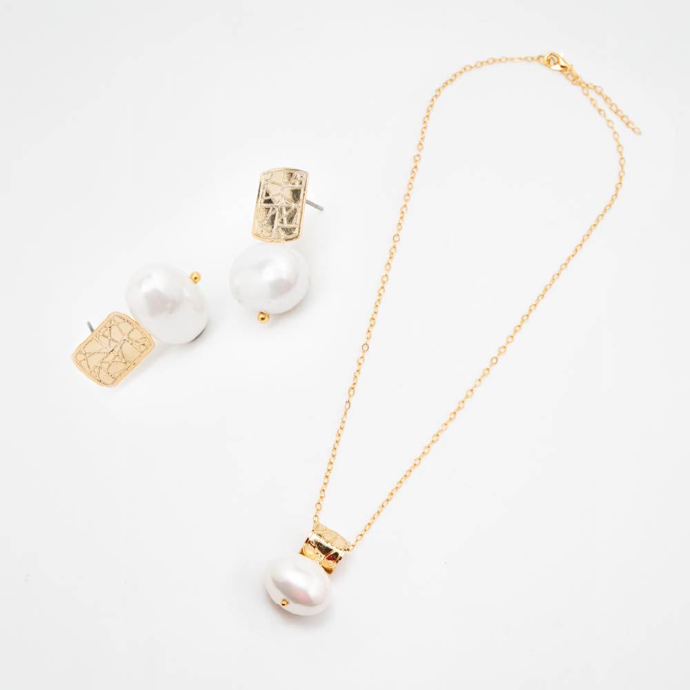 Con el Set Ritual De Amor, regala un toque de elegancia moderna. Su platina dorada de diseño irregular y las perlas colgantes capturan un brillo único, simbolizando la luz y la belleza de tus lazos más preciados.