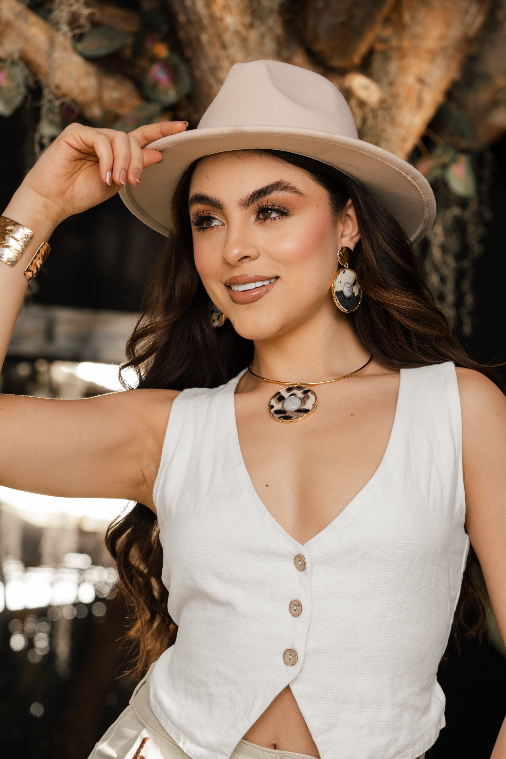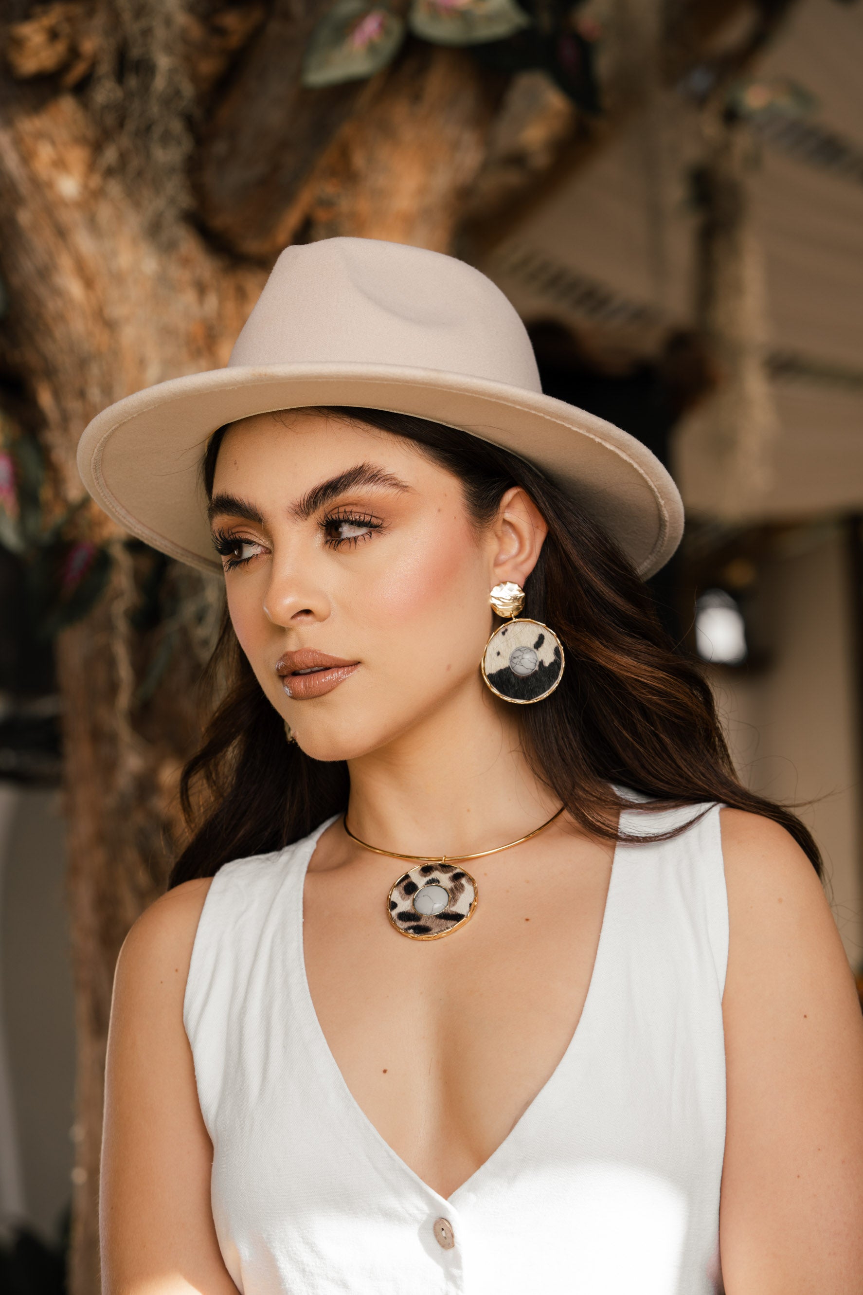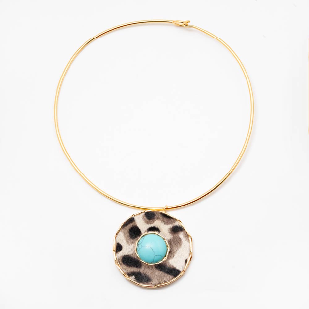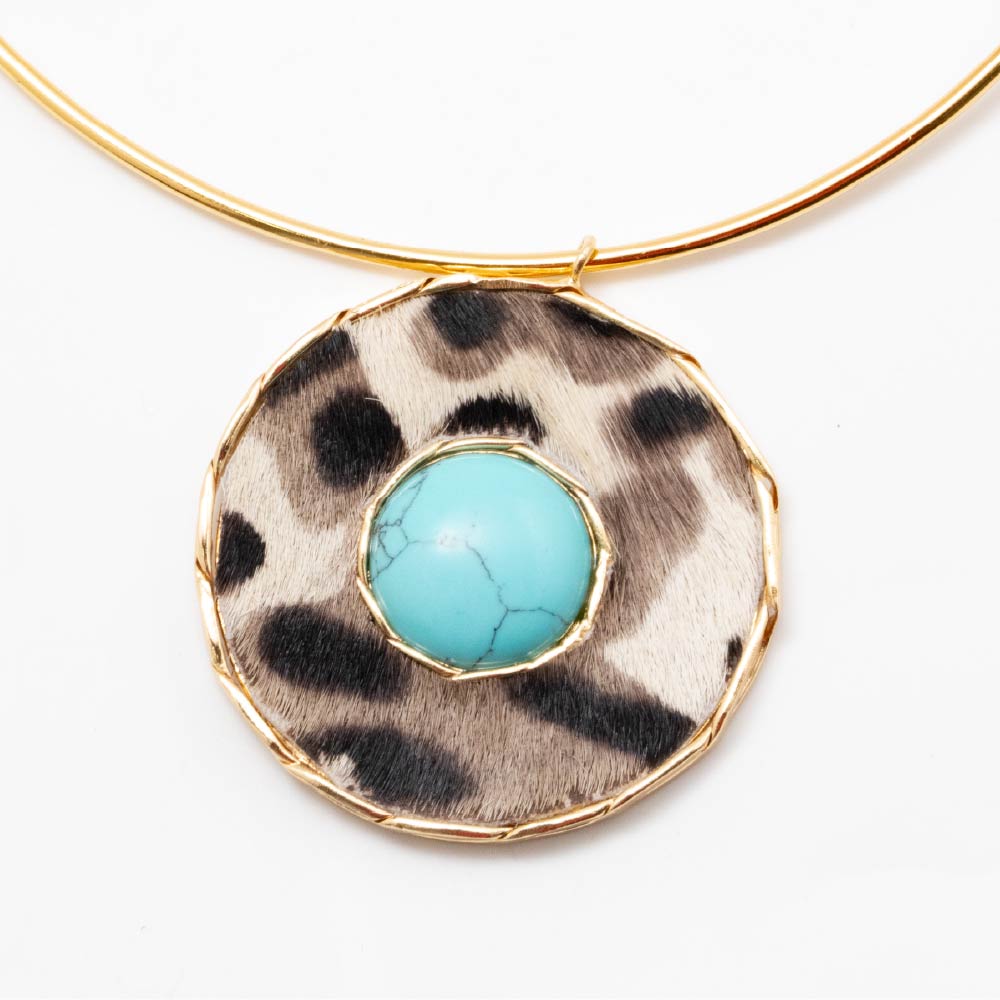 : La Gargantilla Oasis Dorado combina elegancia y carácter en una pieza que resalta por su contraste de texturas y color, presenta un colgante circular con acabado animal print artesanal y una piedra natural turquesa al centro que aporta un toque vibrante y sofisticado, Su diseño versátil la convierte en una pieza ideal para realzar looks elegantes o agregar un acento distintivo a atuendos más casuales. Perfecta para mujeres que buscan piezas con presencia, historia y un acabado impecable.