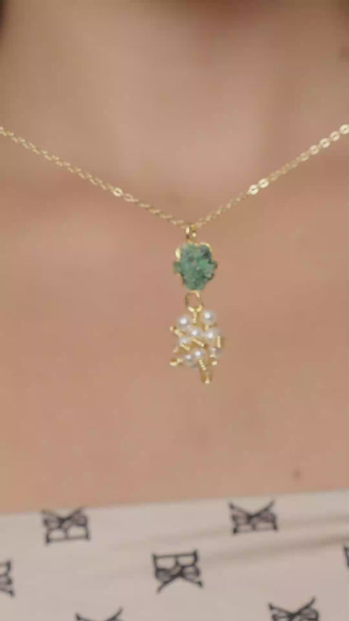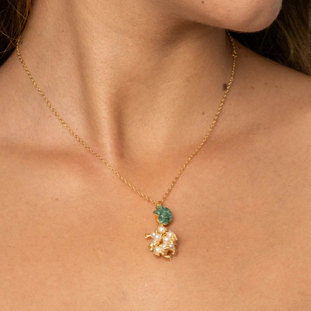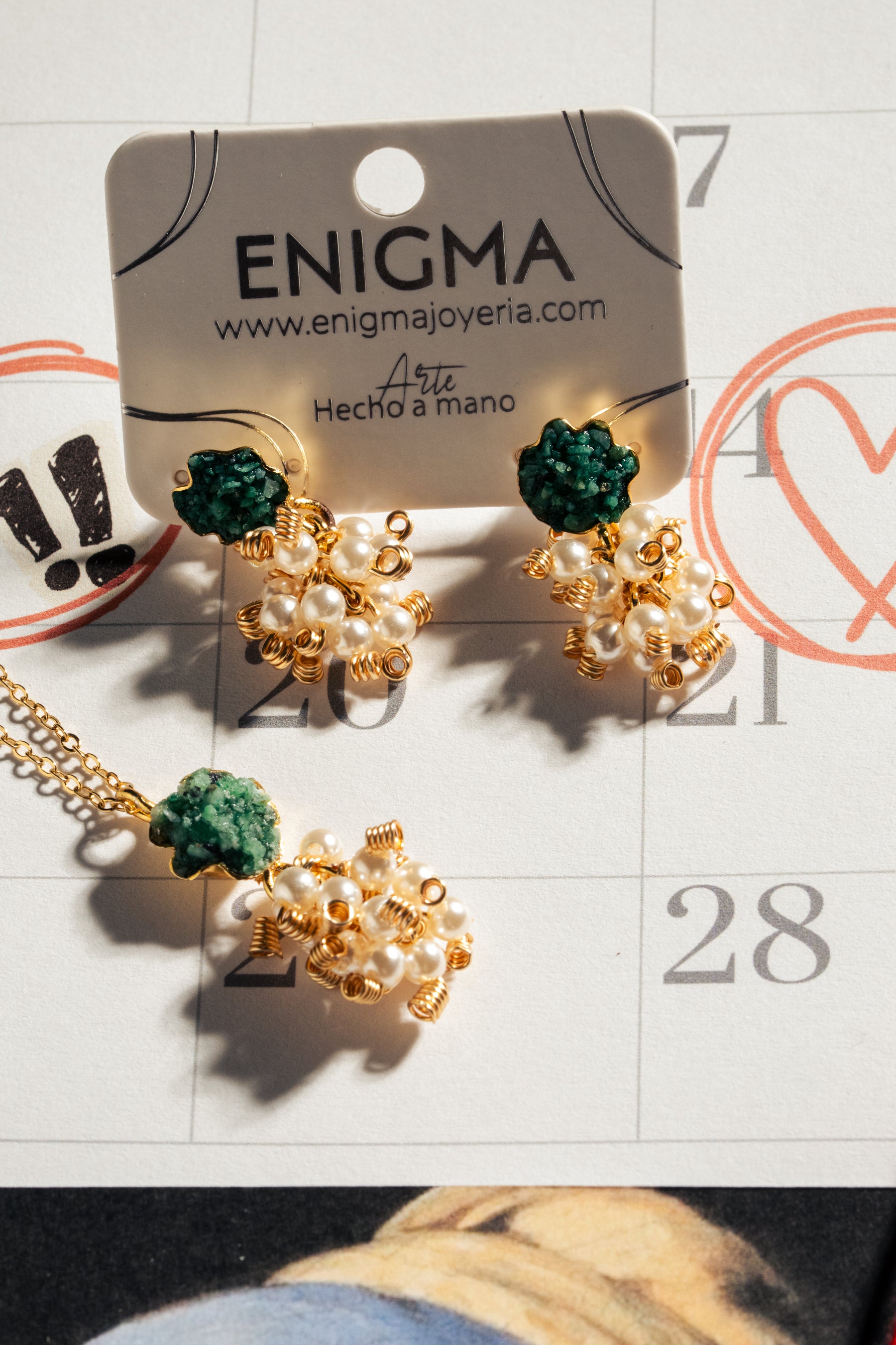 Poder Saturado representa una fortaleza que nace desde la serenidad. La piedra en bruto, firme en la parte superior, actúa como ancla emocional; debajo, la caída de perlas aporta movimiento y sensibilidad, creando un contraste que equilibra carácter y delicadeza. El conjunto se siente seguro, contenido y profundamente femenino: una joya que no busca imponerse, pero que sostiene.