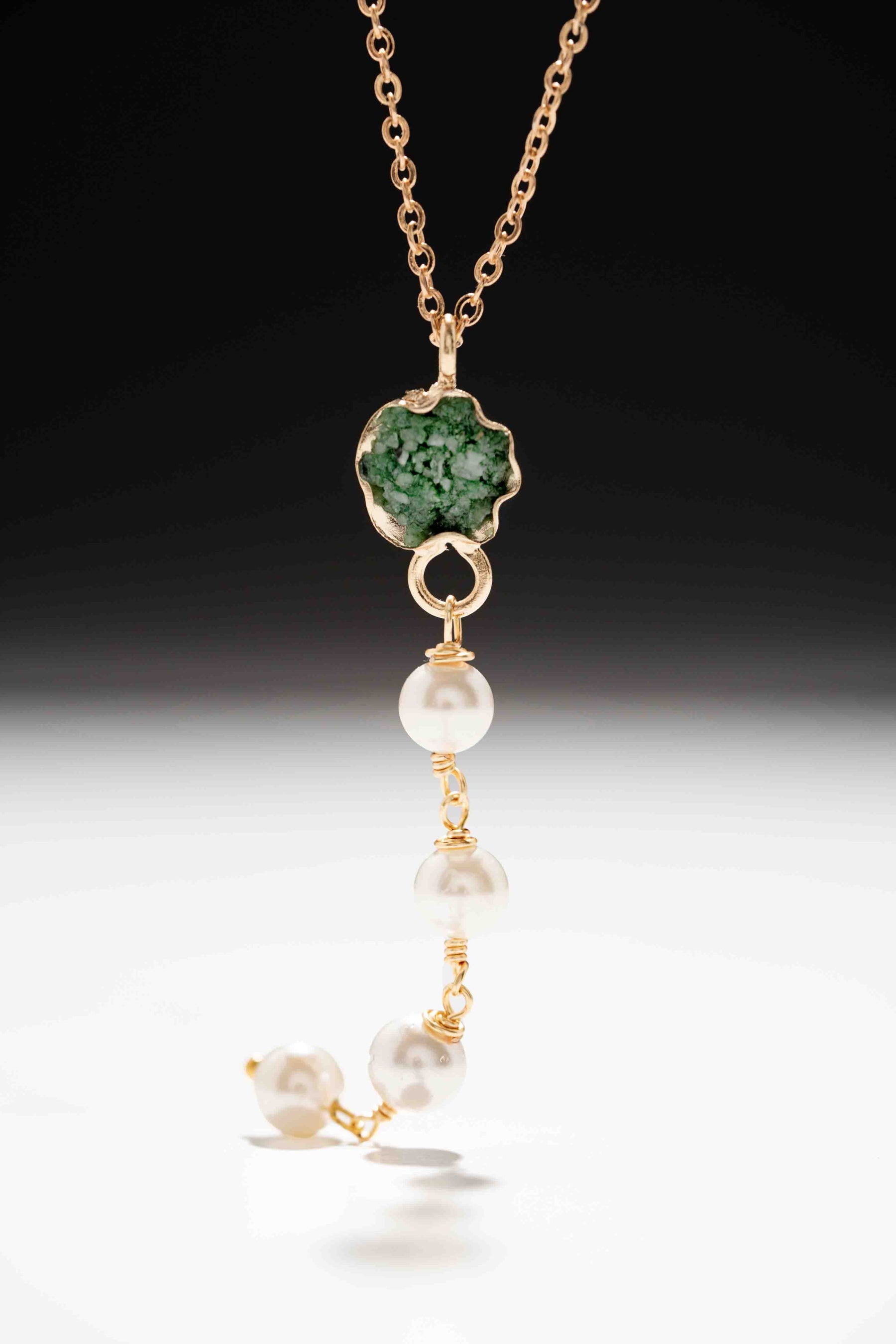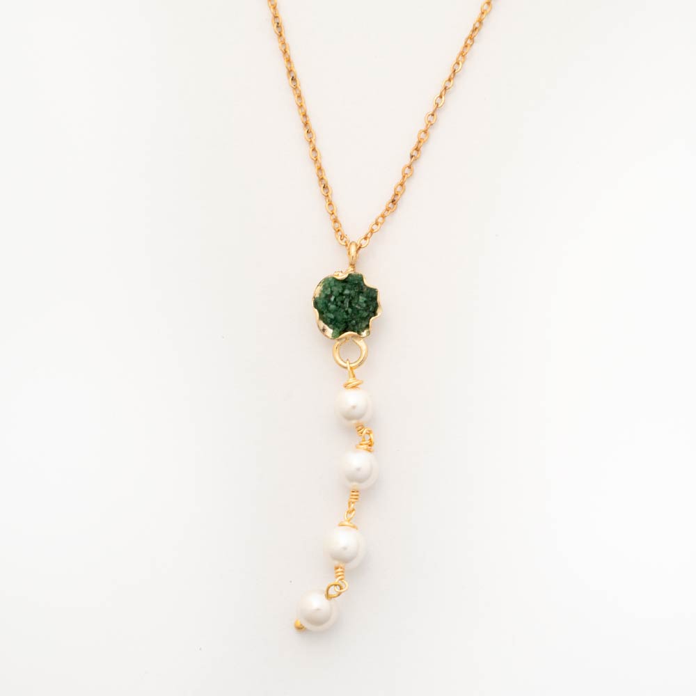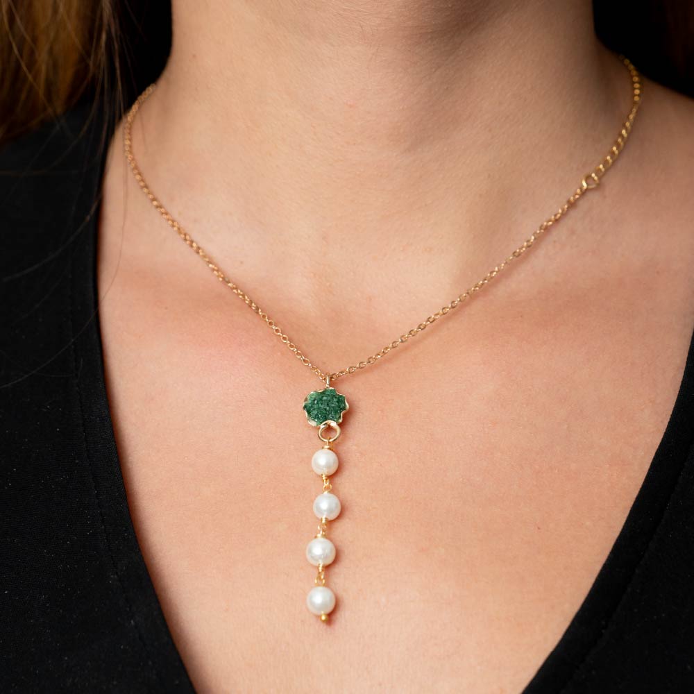 Núcleo Íntimo reúne la profundidad de la esmeralda y la suavidad de las perlas en un gesto cercano y equilibrado. Su caída delicada acompaña el cuerpo con naturalidad, creando una presencia silenciosa que se siente personal y consciente. Es una joya pensada para permanecer cerca, donde el contraste se vuelve armonía y lo esencial toma forma.