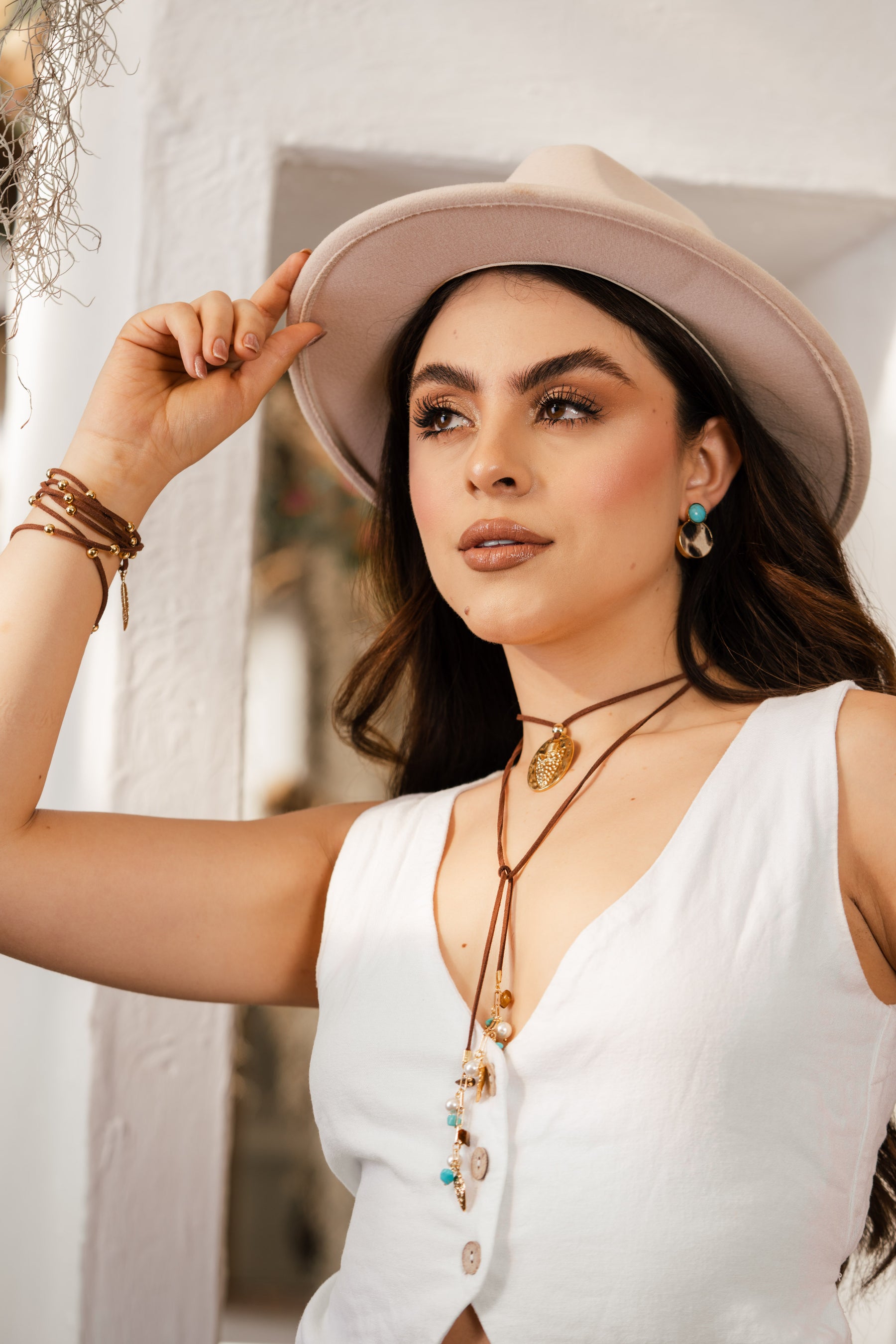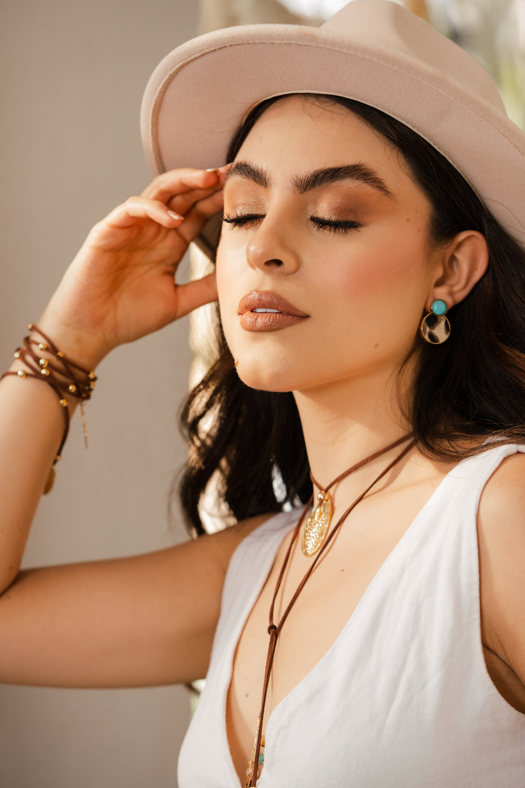 Los Aretes Ruta del Alba evocan los primeros destellos del día sobre los caminos polvorientos del viaje. La piedra turquesa brilla como un faro de esperanza, mientras el cuero moteado refleja la tierra que guarda las huellas del andar. Cada par está hecho para mujeres que renacen con cada amanecer, que encuentran belleza en lo simple y poder en lo natural.