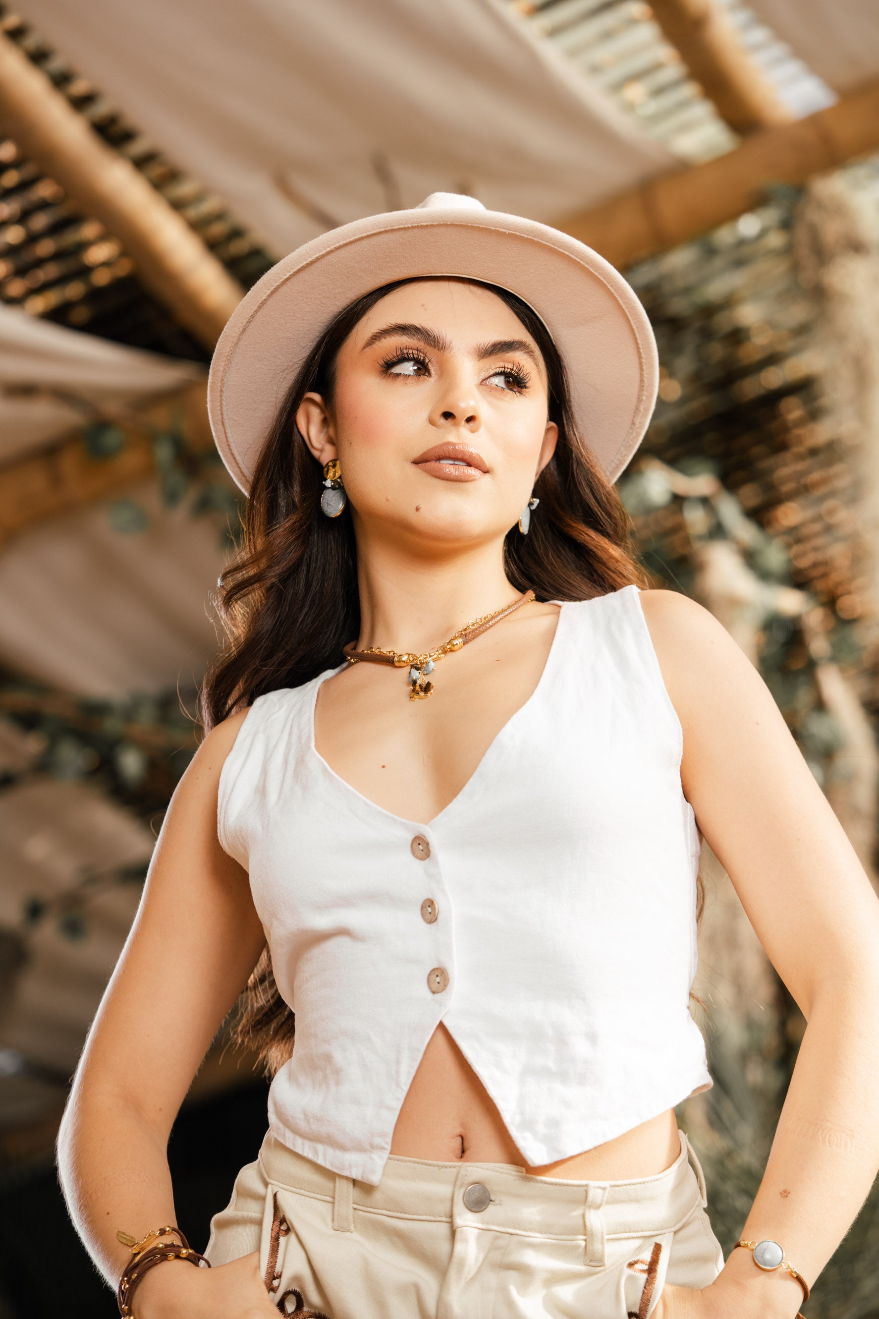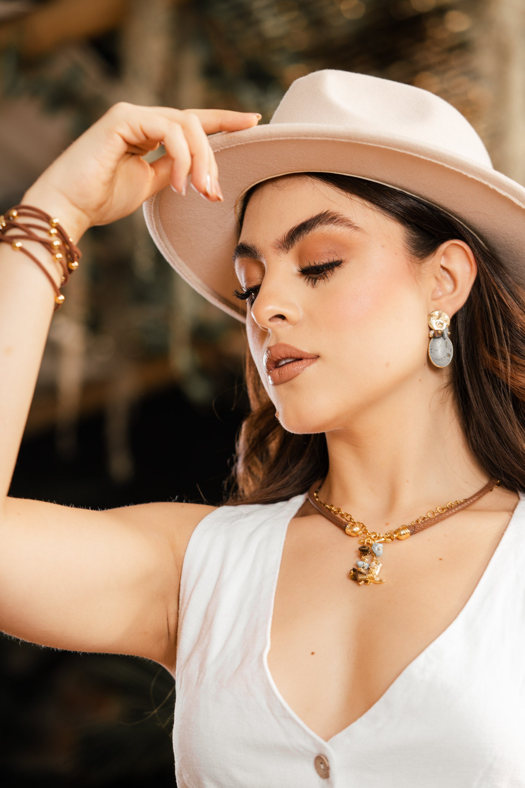 El Collar Destello del Camino surge de la travesía de una mujer que avanza guiada por su propia luz. Inspirado en los reflejos del sol sobre la arena, esta joya combina materiales nobles y texturas que evocan el contraste entre la fuerza del día y la calma del atardecer.
